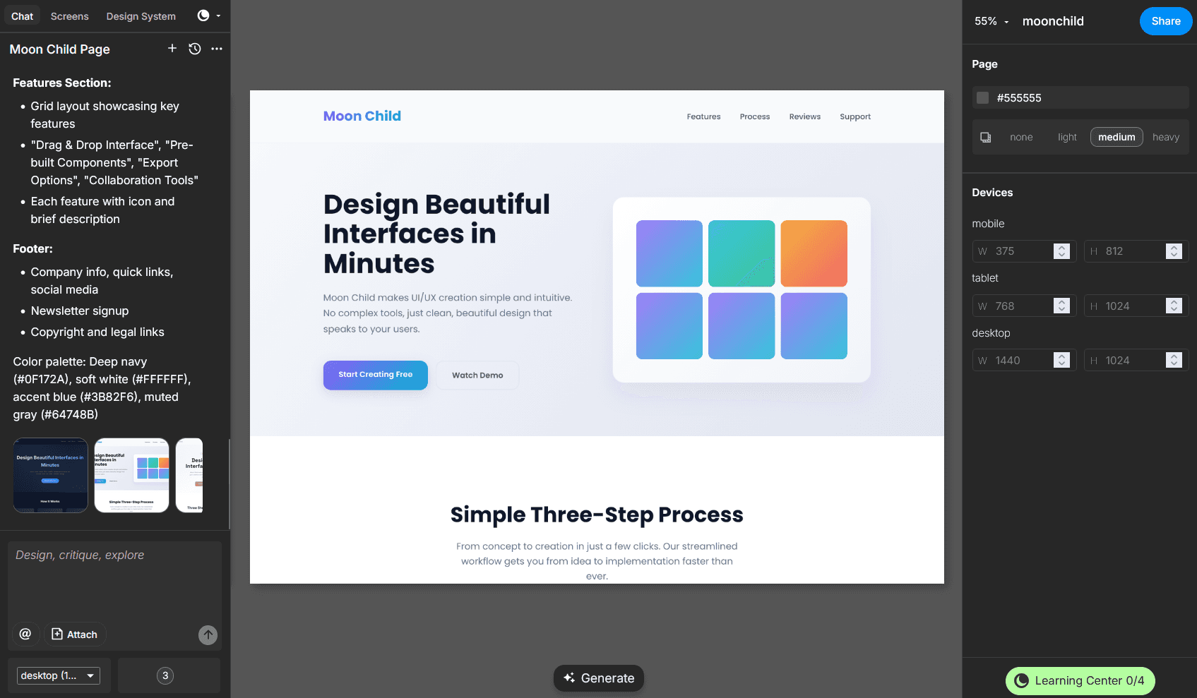 Moonchild is the fastest path from idea to interface, turning rough thoughts into polished testable designs.